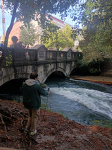 We started with a U-Bahn (subway) ride to Lehel, then strolled along the Isar River toward the massive Englischer Garten. The park felt endless, peaceful, and green — an idyllic city oasis. We stopped at the Eisbach, where locals surf a permanent standing wave under the bridge. It was wild watching wetsuited surfers carving turns right in the middle of the city.